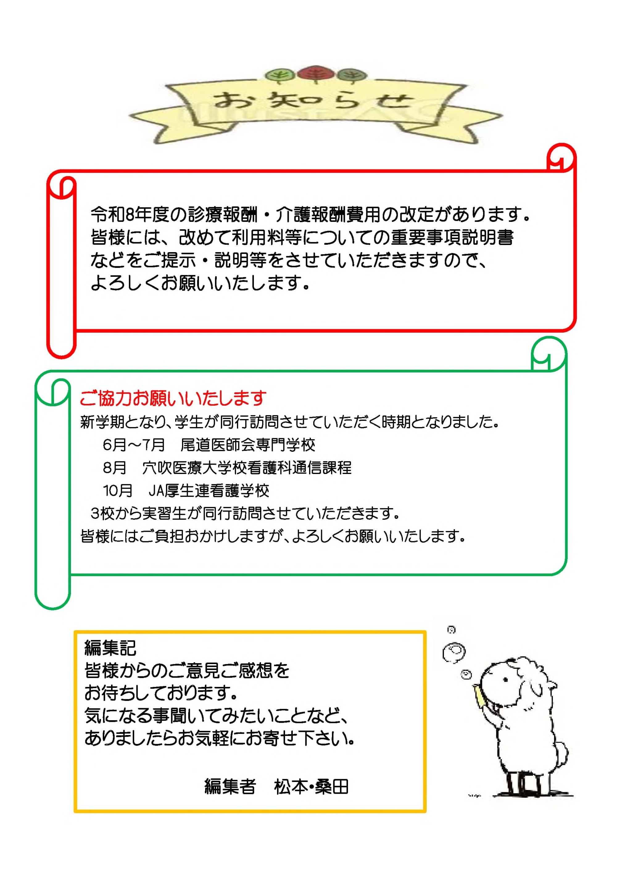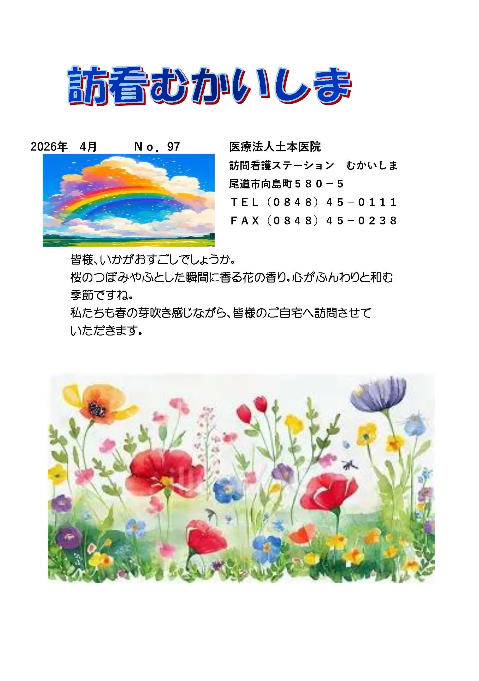 「訪問看護ステーションむかいしま」のスタッフで、訪問先の利用者さんとそのご家族向けにこころをこめて作った新聞です。